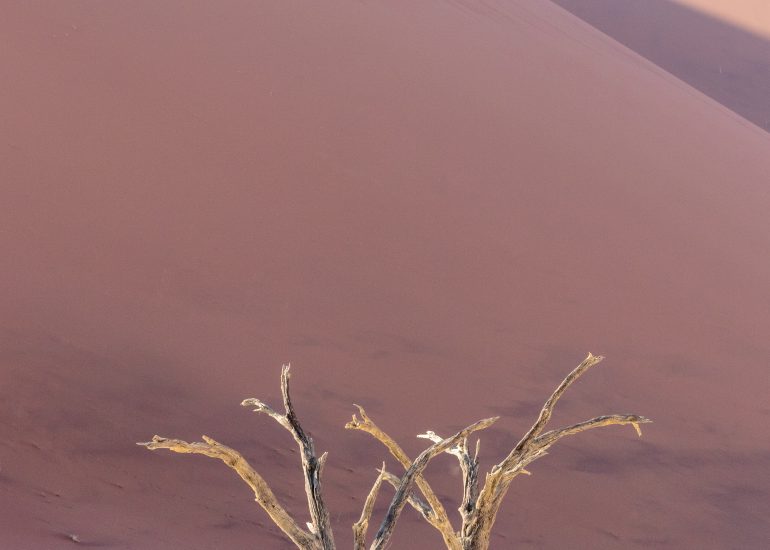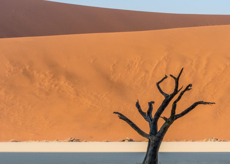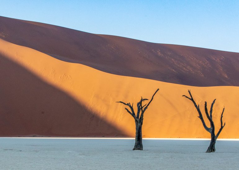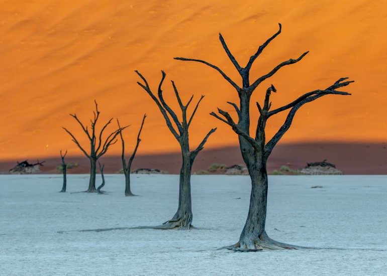 Le Deadvlei et son sol d'argile blanche, niché au cœur des Dunes du Sossusvlei.